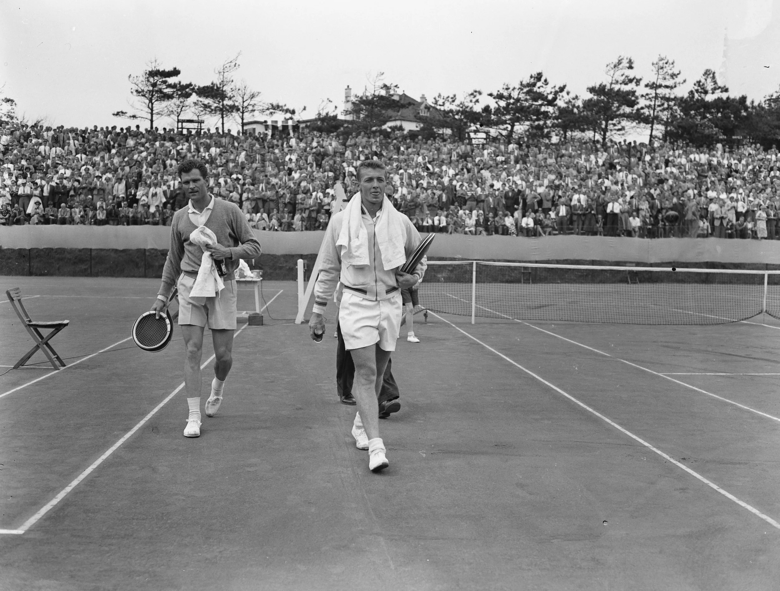 Two male tennis players walking off a tennis court with a large crowd in the background and a net in the foreground.