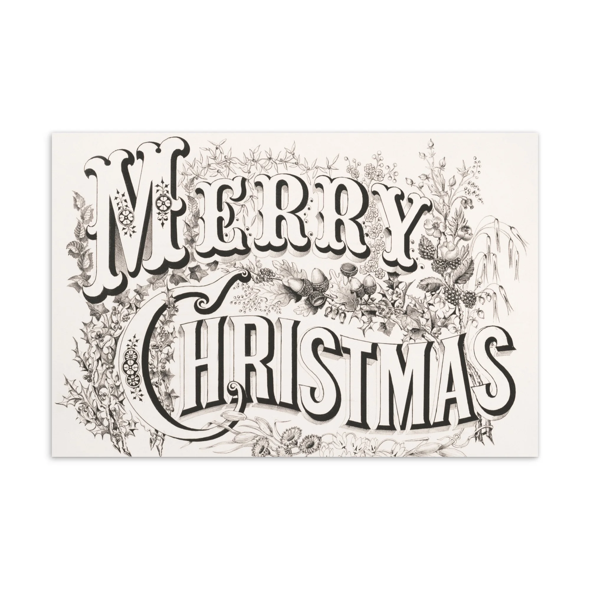 This printed postcard features an ornate “Merry Christmas” design from Currier & Ives, the iconic 19th-century printmaking firm known for its richly detailed lithographs. The bold Victorian lettering, wrapped in delicate winter foliage, creates a striking monochrome greeting that feels both historic and beautifully modern.