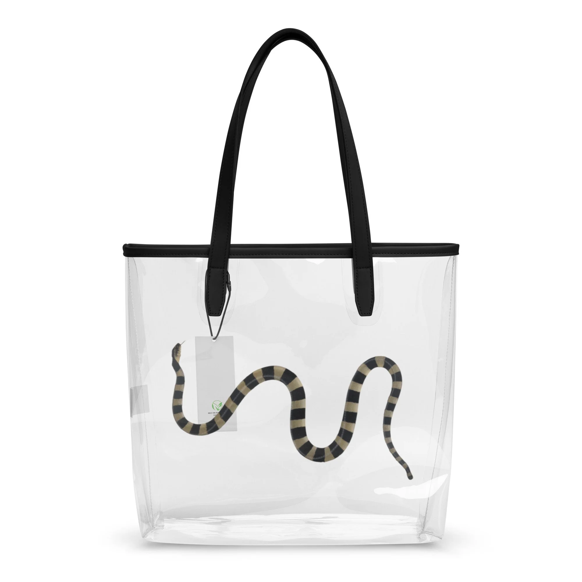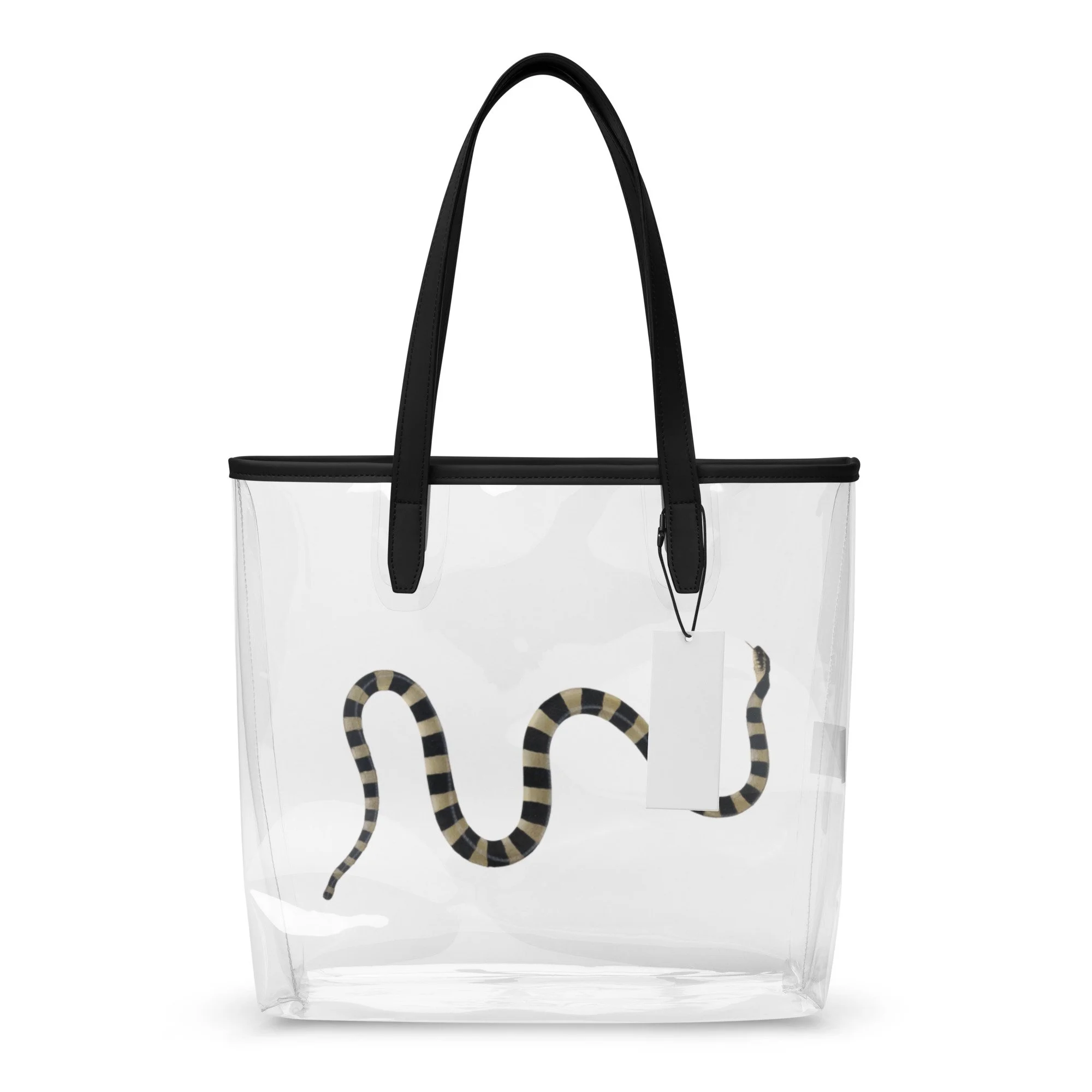 Featuring Bhawani Das’s original 18th-century watercolor of a banded snake, this clear carryall transforms a natural history illustration into a striking modern accessory. The black-and-white coils slither across the bag like a desert phantom, mysterious, mesmerizing, and impossible to ignore.