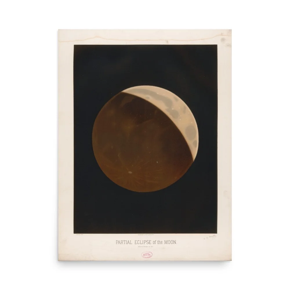 In the late nineteenth century, long before the camera’s lens came to define how we see the night sky, the French astronomer and artist Étienne Léopold Trouvelot sought to translate celestial motion into human vision. His Partial Eclipse of the Moon, observed in 1874, is both scientific record and nocturne, a moment when the heavens themselves seem to dim and breathe. The moon, rendered in bruised copper and milk-white light, hovers between illumination and erasure.