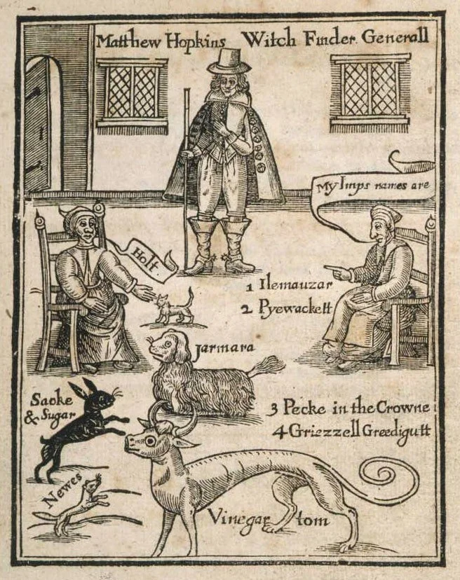 Frontispiece to Matthew Hopkins' Discovery of Witches (1648) showing two witches calling out the names of their demons while Hopkins watches above.