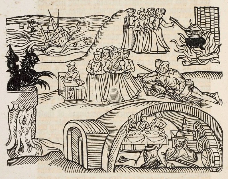 The primary woodcut condenses several episodes from the story into a single image. The witches were accused of sending devils to stir up waves, and in the top left of the image, demons are seen swimming around James’ ship. In the top right, women are portrayed toiling around a cauldron, suggestive of sorcery, as they watch the fire burn and cauldron bubble.