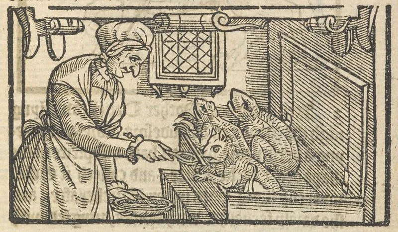 Witch pictured feeding her familiars with blood, in A Rehearsall both Straung and True, of Hainous and Horrible Actes Committed by Elizabeth Stile (1579).
