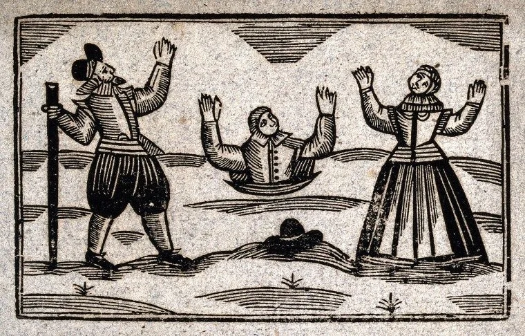 Woodcut depicting the "sink or float" method of seeking out witches, featured in The History of Witches and Wizards (1720).