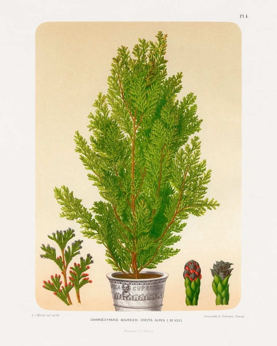 Chamcecyparis boursieri erecta aurea (de vos) chromolithograph plates by Abraham Jacobus Wendel.