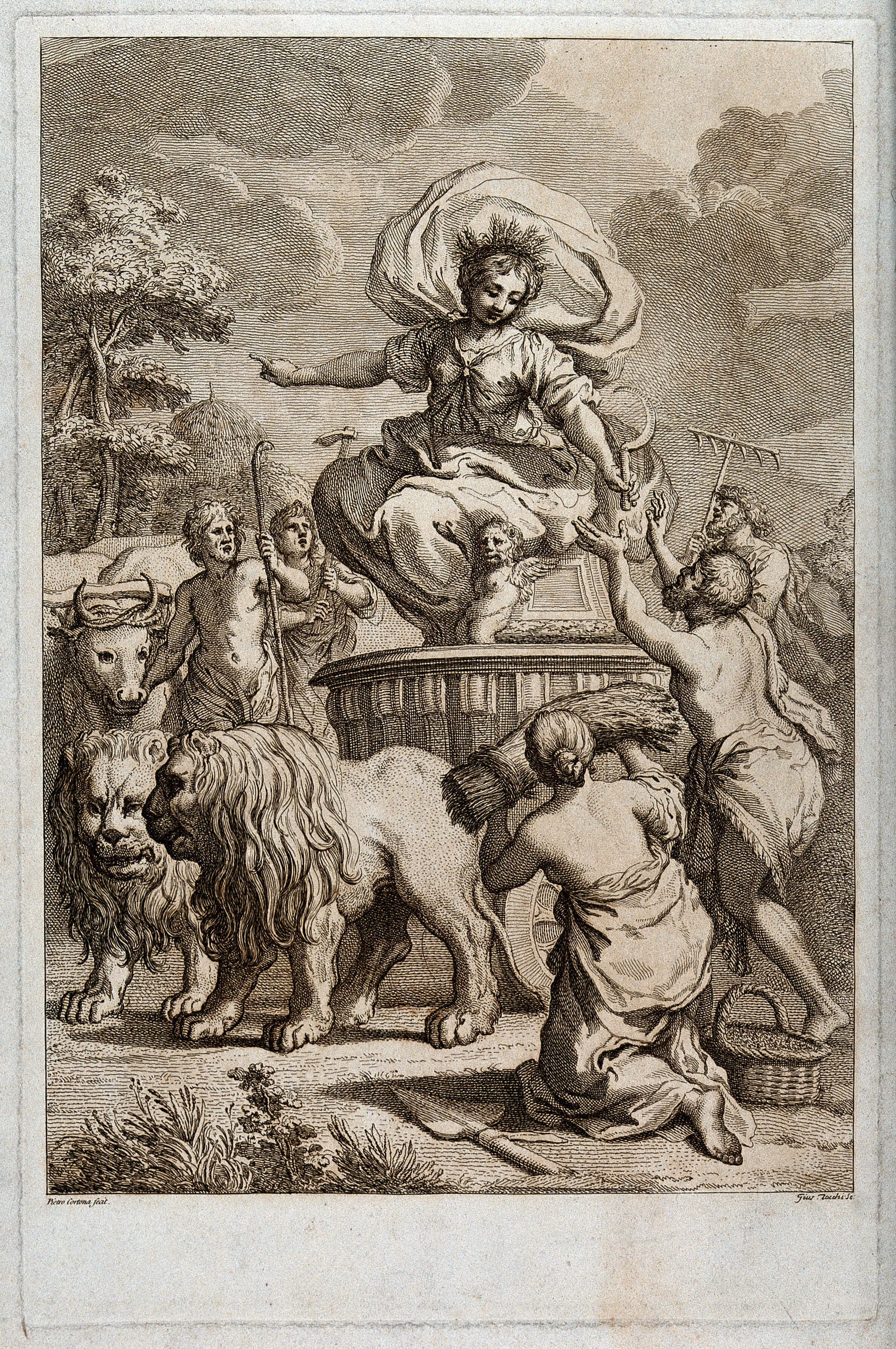 Demeter on a chariot drawn by lions receives offerings from peasants; representing harvest. Etching by G. Zocchi.