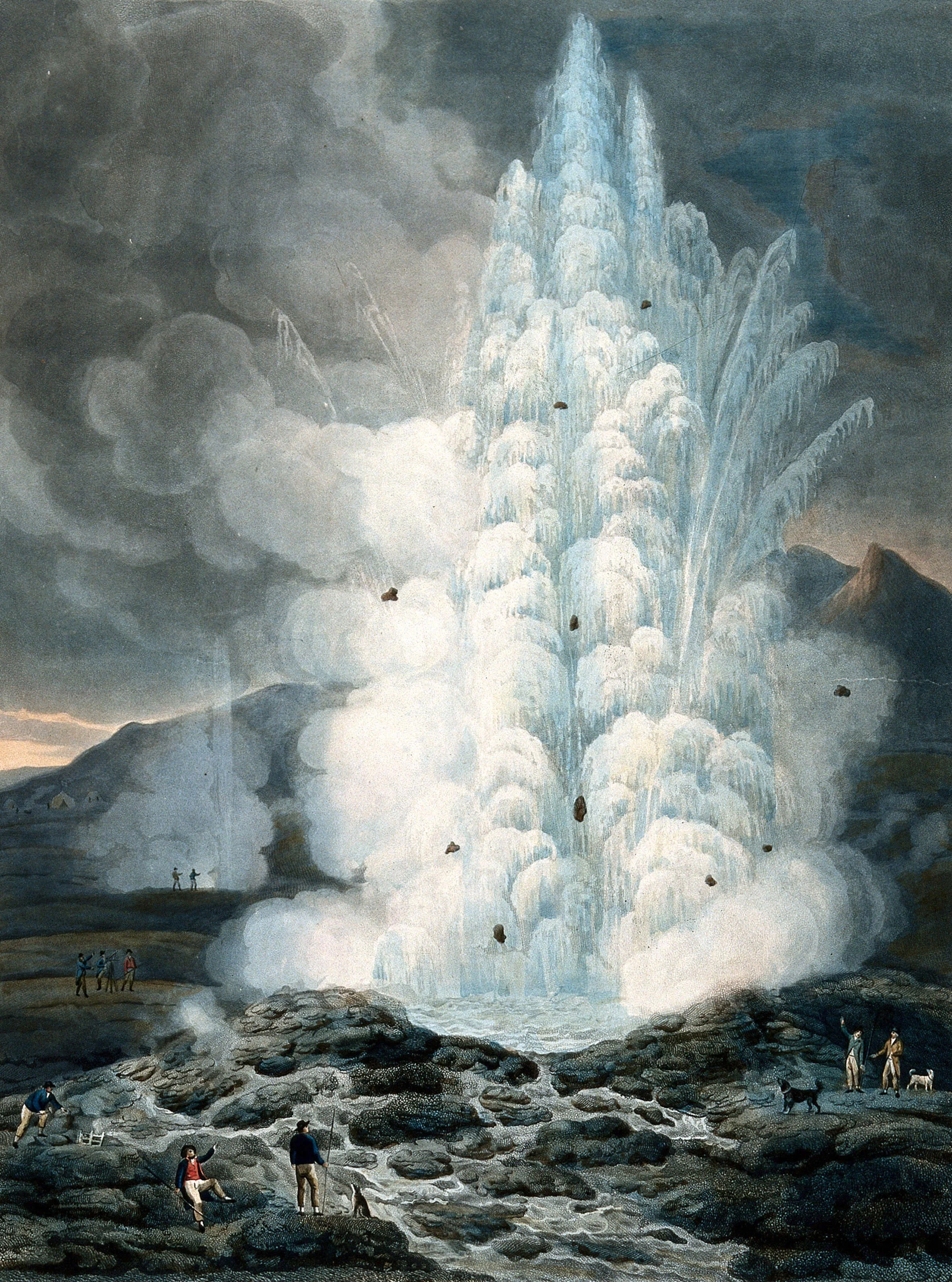 A hot spring in Iceland; people in the foreground. Coloured aquatint by F. Chesham, December 1796.